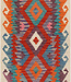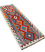 Dieser afghanische Kilim-Teppich (Maße: 244x79 cm) kombiniert übereinanderliegende Diamant-Motive mit dynamischen Zickzack-Kanten in kräftigen Farben wie Türkis, Koralle, Violett und Elfenbein. Handgewebt aus 100% Wolle und gefärbt mit natürlichen Farbsto Lesen Sie mehr..