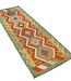 Dieser afghanische Kilim-Teppich misst 240x79 cm und wurde mit traditionellen Techniken aus 100% Wolle handgewebt. Das kräftige Diamantmuster ist in natürlichen Erdtönen wie Grün, Ocker, Braun, Rot und Elfenbein gehalten. Der Teppich ist beidseitig verwendbar, leicht und mit pflanzlichen Farbstoffen gefärbt – ideal für Flure, Eingangsbereiche oder rustikale Wohnräume.