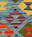 Dieser Afghanische Kilim-Teppich in der Größe 238x80 cm vereint traditionelle Handwerkskunst mit einem auffälligen Design. Das Muster aus Sanduhrmotiven in lebendigen Farben wie Gelb, Türkis, Rot, Grün und Lila liegt auf einem kühlen Blauton und wird von einer kräftigen schwarzen Bordüre eingerahmt. Handgewebt aus 100% Naturwolle und gefärbt mit pflanzlichen Farbstoffen – ideal für Flure, kreative Räume oder Boho-Wohnstile.