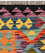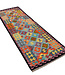 Dieser Afghanische Kilim-Teppich in der Größe 238x80 cm vereint traditionelle Handwerkskunst mit einem auffälligen Design. Das Muster aus Sanduhrmotiven in lebendigen Farben wie Gelb, Türkis, Rot, Grün und Lila liegt auf einem kühlen Blauton und wird von Lesen Sie mehr..
