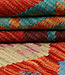 Farben wie Türkis, Elfenbein, Orange, Lavendel und Gelb bilden starke Kontraste. Das symmetrische Design betont den ethnischen Charakter. Aus robuster Wolle gefertigt, bietet der Teppich Langlebigkeit und kulturellen Stil – perfekt für boho oder ethnisch inspirierte Räume.