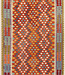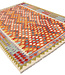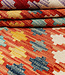 Handgewebter afghanischer Kilim mit lebhaften Stammesmustern und bunter Farbpalette. Perfekt als Blickfang für jedes Zuhause. Lesen Sie mehr..