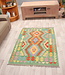 This elegant, colorful and unique handwoven Afghan kilim rug from Afghanistan is made out of Ghazni wool, which is known as the best wool in this region.