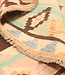 Beautiful hand-woven traditional kilim carpet from Afghanistan, beautiful soft colours, certainly not a 'hard' fabric like most kilims!, but timeless and suitable for all types of interior styles due to the colours