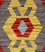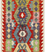 This unique Afghan Kilim rug (size 239x77 cm) brings bold geometric artistry into any space. Featuring large, stylized medallions in vibrant tones of red, mustard, green, lavender, and navy, it is framed by a colorful stepped border that creates rhythm an Read more..