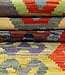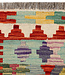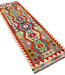 This unique Afghan Kilim rug (size 239x77 cm) brings bold geometric artistry into any space. Featuring large, stylized medallions in vibrant tones of red, mustard, green, lavender, and navy, it is framed by a colorful stepped border that creates rhythm and movement. Woven by hand using 100% wool and natural vegetable dyes, it is both reversible and durable, making it ideal for hallways, studios, or eclectic interiors.