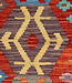 A vibrant Afghan Kilim with a red base, showcasing bold hexagonal tribal motifs in turquoise, ivory, lavender, and orange. Handwoven in wool for durability and style. Read more..