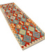 This 252x83 cm handwoven kilim runner features soft tribal diamond motifs in a warm and balanced color palette. Rich reds, soft mint greens, lavender, teal, orange, and pale yellow tones contrast beautifully against the creamy background, creating a harmo Read more..