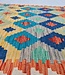 This elegant, colorful and unique hand woven Afghan kilim rug from Afghanistan is made out of Ghazny wool which is known as the best wool in this region.
