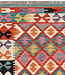 Geef je interieur een unieke uitstraling met dit prachtige handgeweven Afghaanse Kelim tapijt van 290x196 cm. Het tapijt toont een levendig geometrisch patroon in warme tinten rood, oranje, blauw en roze. Gemaakt van 100% wol, is het duurzaam, milieuvriendelijk en perfect voor een boho of etnisch interieur. Het platte weefsel is licht van gewicht, omkeerbaar en eenvoudig te onderhouden.