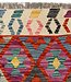Breng kleur en karakter in je interieur met deze handgeweven kilim loper van 253x87 cm. Gemaakt van 100% natuurlijke wol, straalt dit vloerkleed in tinten van rood, groen, roze, paars, geel en blauwgroen. De geometrische diamant- en zandloperpatronen geven het een rijke etnische uitstraling, terwijl de rand het geheel mooi omlijst. Ideaal voor bohemian, eclectische of rustieke woonstijlen. Een uniek kunstwerk voor je vloer.