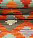 Breng kleur en karakter in je huis met deze levendige kilim loper van 246x79 cm. Met de hand geweven van 100% wol en voorzien van opvallende ruitpatronen in rood, oranje, blauw en groen, is dit tapijt een echte blikvanger. De platte weeftechniek maakt het ideaal voor druk belopen ruimtes zoals gangen, of zelfs als uniek wandkleed.