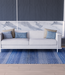 Het dominante kleurenschema van dit vloerkleed is een boeiende blauwtint, die een gevoel van kalmte en sereniteit oproept. Wat dit stuk echter echt onderscheidt, is de integratie van kunstzinnige accenten in het ontwerp.