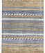 Het vloerkleed heeft een reeks afwisselende strepen in blauw- en bruintinten, die de basis vormen van het ontwerp. Deze strepen zijn versierd met ingewikkelde motieven en patronen, waardoor diepte en complexiteit aan de algehele compositie worden toegevoegd. Van geometrische vormen tot bloemige accenten, elk detail is zorgvuldig tot in de perfectie geweven, waardoor een visueel feest voor de zintuigen ontstaat.
